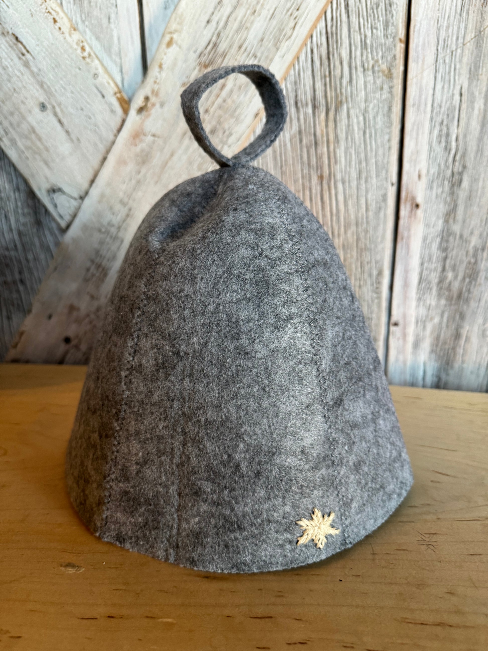 Made right here at my kitchen table and embellished with a small hand stitched white snowflake. Wool sauna hats are traditionally worn to protect the head from the intense heat of the sauna. The insulating hat helps prevent the scalp from overheating while allowing the body to fully enjoy the sauna's benefits. This insulation maintains a comfortable, steady temperature around the head, which helps avoid dizziness and prolongs the time one can comfortably spend in the heat. Wool's breathability also makes it ideal, as it can wick away moisture, ensuring comfort without trapping sweat. The hat has become a ritualistic accessory in sauna culture, combining practicality with tradition.